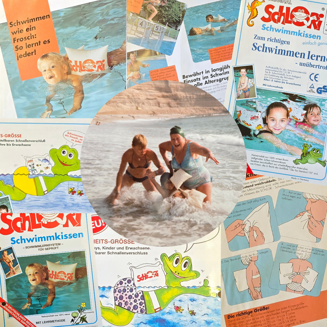 Heute führen wir diese Idee in dritter Generation weiter. Wir fertigen die Schlori-Kissen noch immer in Deutschland, aus natürlichen, schadstofffreien Materialien, mit der gleichen Hingabe wie damals. Über 1,5 Millionen Kinder haben mit ihnen Schwimmen gelernt – Schritt für Schritt, selbstbestimmt, mutig.